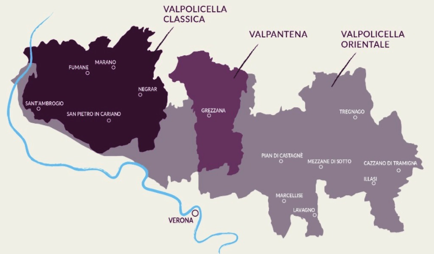 Le Valpolicella est situé au nord de Vérone. Il borde le lac de Garde à l’ouest et est protégé par les montagnes Lessini à l’est et au nord. Il couvre la région des contreforts de Vérone, qui fait partie des Alpes orientales. La région de Valpolicella est divisée en trois zones: la zone classico laquelle produit les meilleurs vins, la zone centrale Valpantena et la zone dite Orientale plus à l’est.
