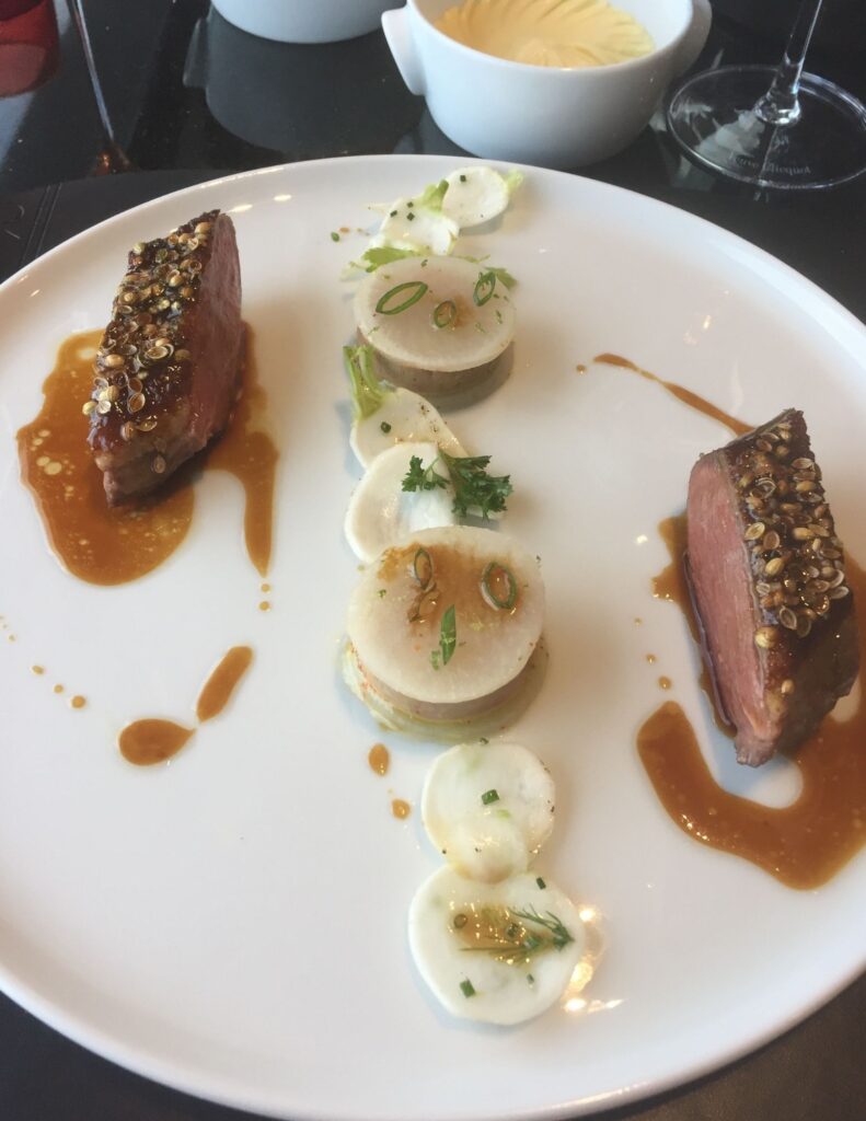 Le Canard : le suprême laqué à l’érable et à la coriandre aux rouelles de navet et foie gras acidulées accompagné du Veuve Clicquot Rosé 2008.