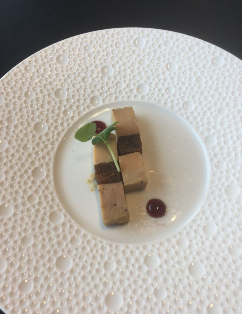 Pour Commencer : Le foie gras et la rhubarbe en millefeuille accompagnés du Veuve Clicquot NM (non millésimé) Rosé.
