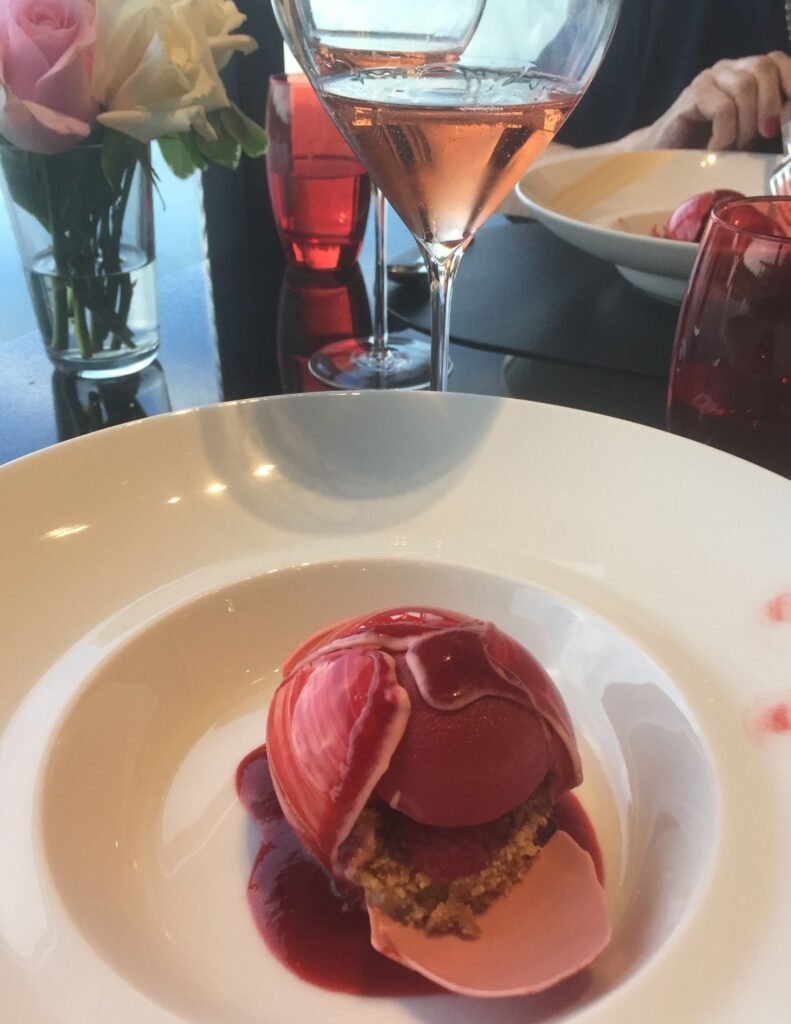 La Framboise : en surprise, crème au citron vert, sorbet acidulé au parfum de lime kaffir accompagné du Veuve Clicquot Rich Rosé.