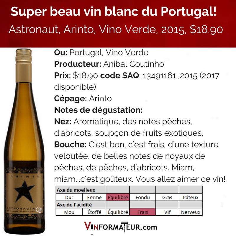 Astronaut, Arinto, Vine Verde, 2015, $18.90, code SAQ : 13491161 (le 2017 est disponible à la SAQ selon le site)