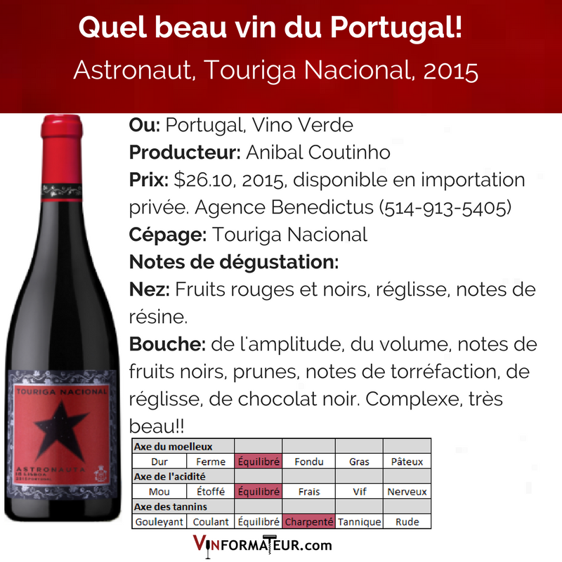 Le Astronaut, Touriga Nacional, 2015, disponible en importation privée, caisse de 12, $26.10. Contactez Benoît Lecavalier (514-913-5405)
