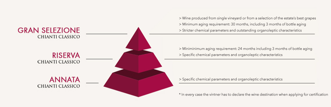 La classification des vins issus de la région se décline soit en Annata Chianti Classico, Riserva Chianti Classico et en une nouvelle classification Gran Selezione Chianti Classico.