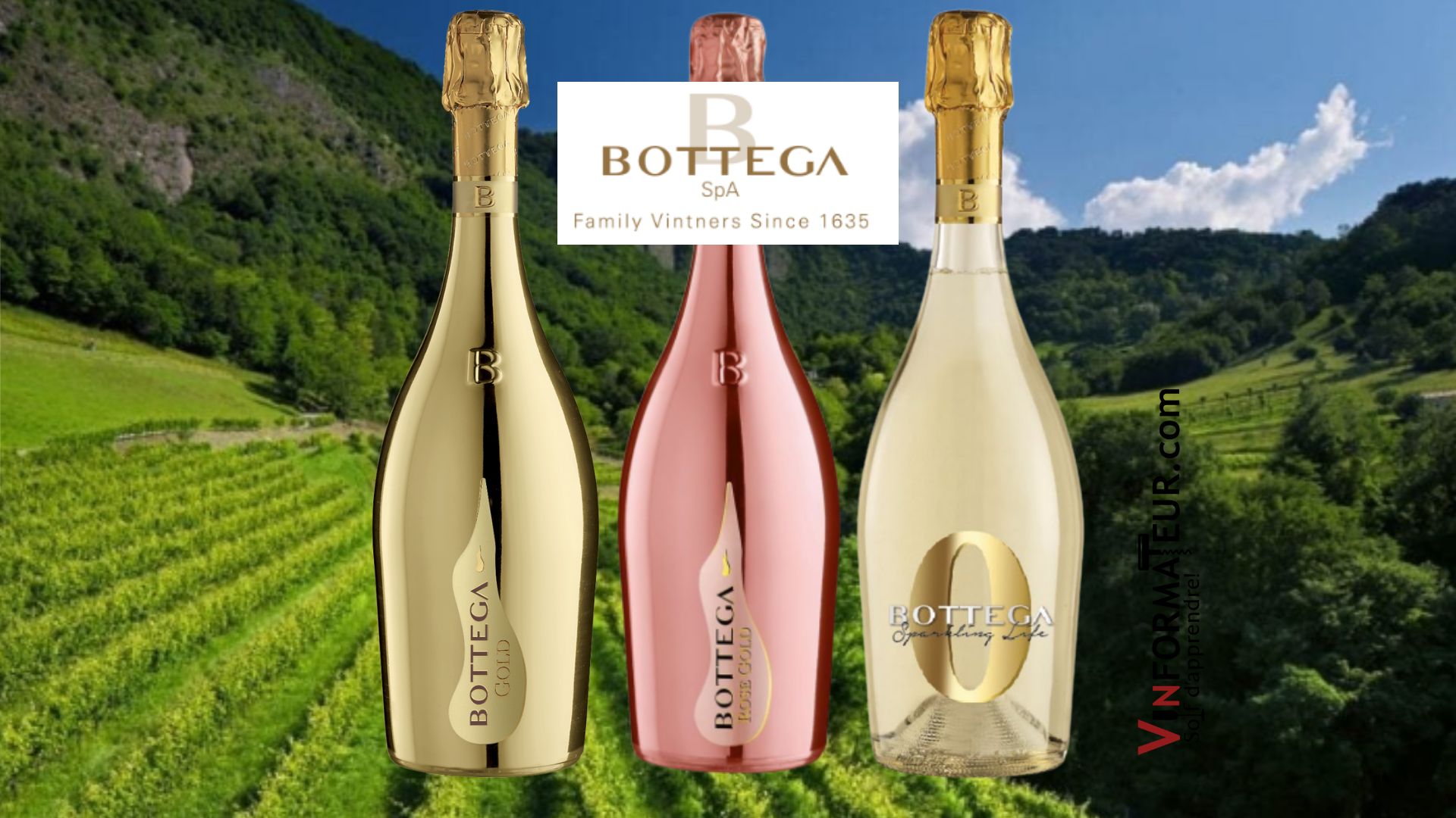 Des bulles Bottega: Bottega Gold, Prosecco, Brut, Rosé Gold, Pinot Nero Spumante Brut Rosé, Bottega Sparkling Zero. bouteilles