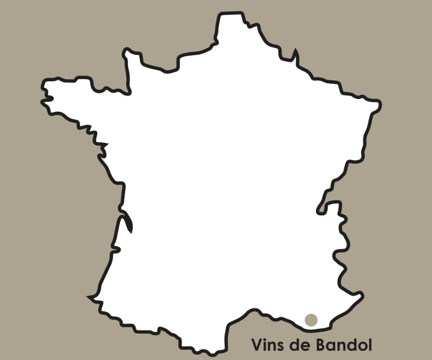 Cette appellation Bandol fait partie de la Provence et s’étale sur 1,480 hectares avec ses 450 vignerons et ses 64 propriétaires. À l’abri du massif de la Sainte Baume au Nord qui culmine à 1147 m, le vignoble de Bandol descend en restanques (terrasses) vers la mer parmi des collines boisées. Elle est surtout reconnue pour ses vins élaborés avec le Mourvèdre autant en rosés bien spécifiques à la région et pour ses rouges avec des tannins assez corsés qui sont de réels vins de garde. On y produits approx. 10% de vins blancs surtout avec la Clairette et l’Ugni. Approx 33% des vignobles sont en culture bio.