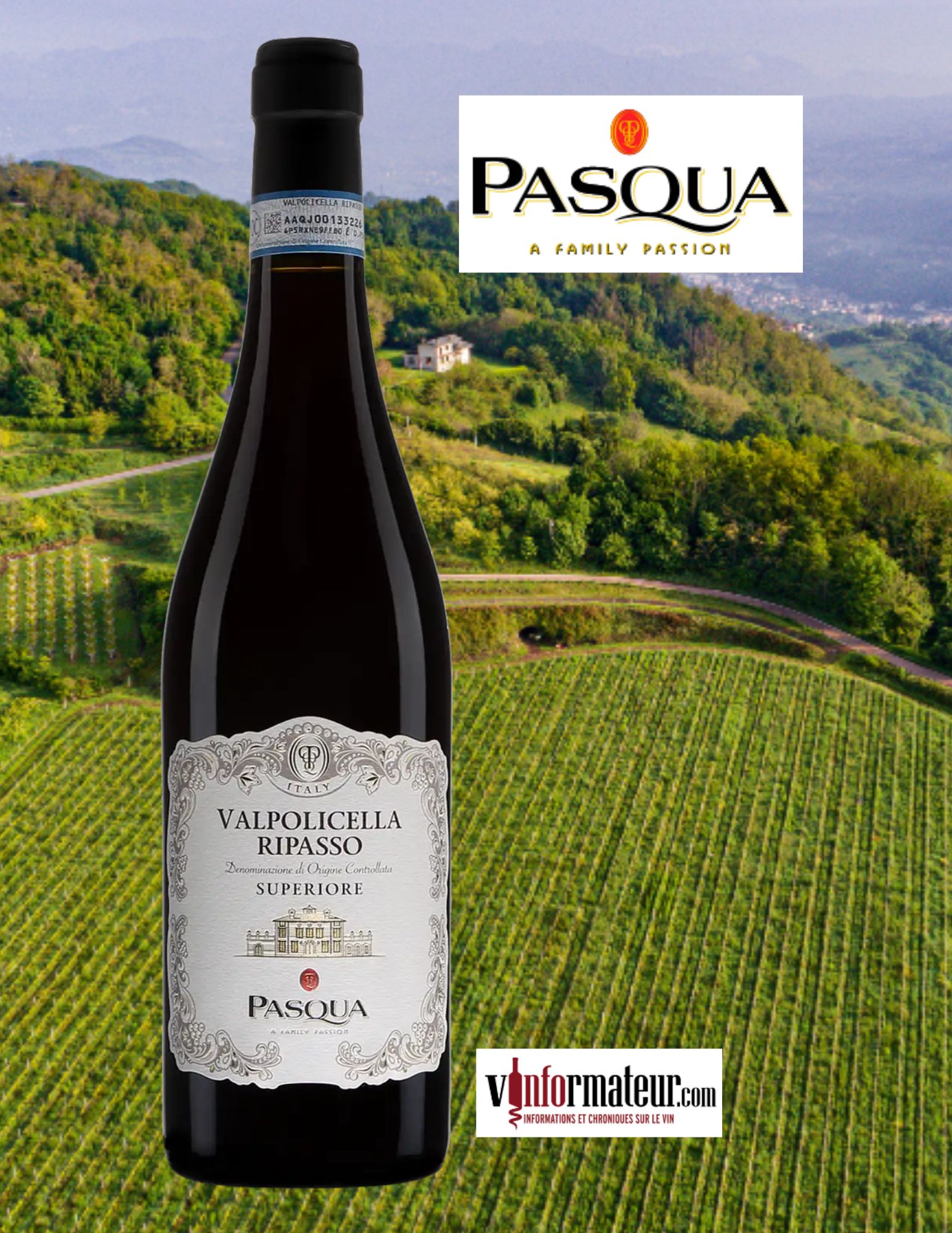 Valpolicella Ripasso Superiore DOC, Pasqua, Vénétie, vin rouge, 2021, 24,95$, cépages : Corvina 70 %, Rondinella 20 %, Négrette 10 %, sucre : 9.3 g/l, alc. : 13.5%, code SAQ : 602342.