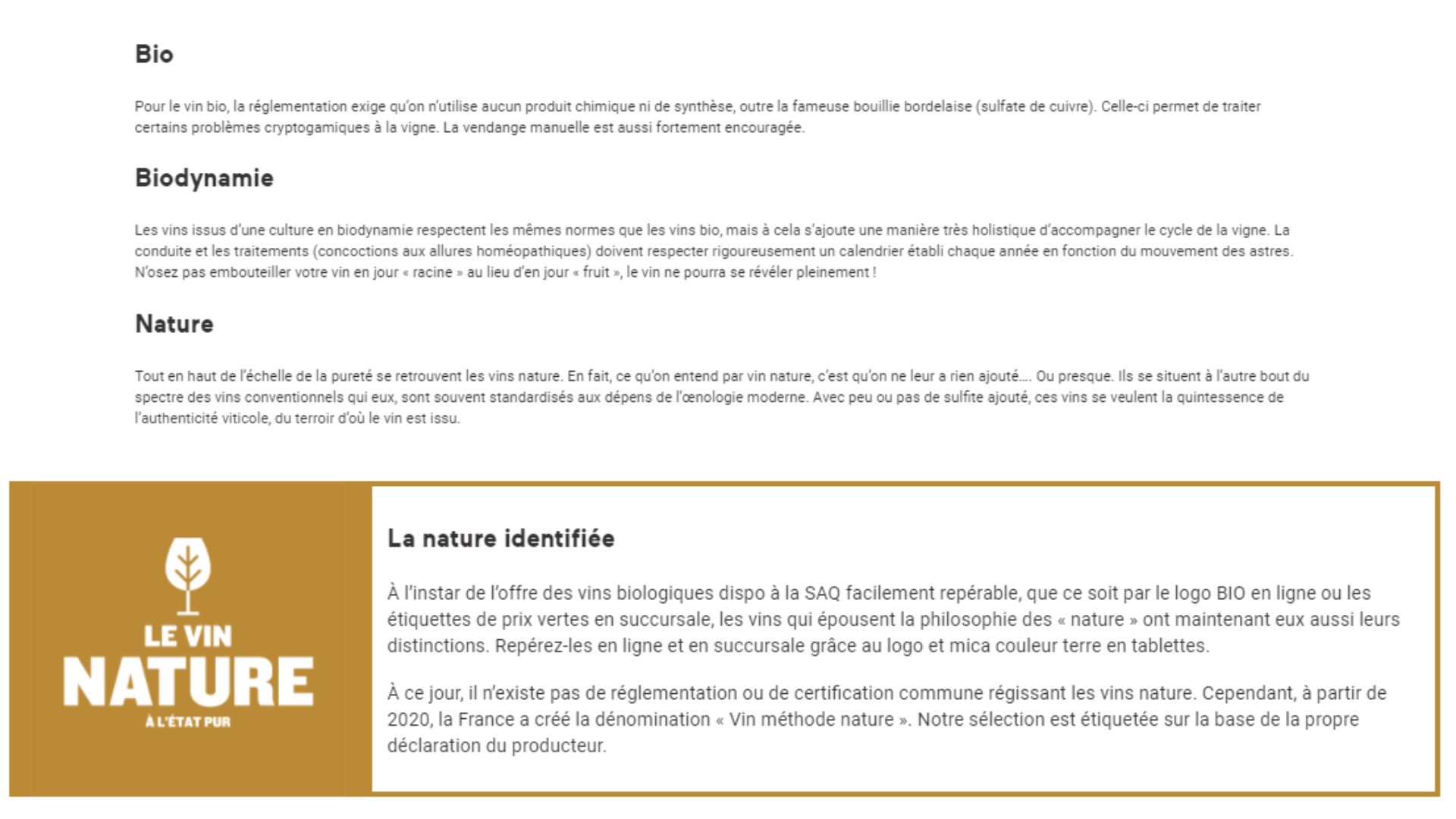 Les vins ‘’bio’’ selon l’organisme Ecocert (Europe) se résument ainsi : ce sont des vins qui ont été produits selon les préceptes suivants : la non-utilisation de produits chimiques de synthèse (pas d’insecticides) la non-utilisation d’OGM, la limitation des sulfites, le maintien de la biodiversité et le respect des cycles naturels et du bien-être animal et ce, pour la protection de l’environnement et du climat et la conservation de la fertilité des sols.