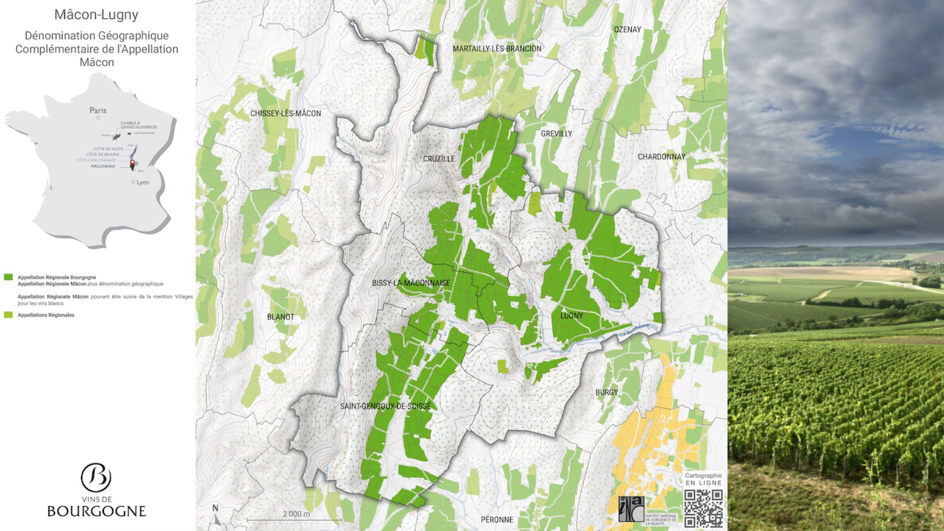 Située dans le Mâconnais, au sud de la Bourgogne, l’aire d’appellation Mâcon-Lugny repose sur des terroirs historiques façonnés par la viticulture depuis le Xe siècle. Le lieu-dit « Les Crays », à Saint-Gengoux-de-Scissé, se trouve à 300 mètres d’altitude, à proximité de Cluny et au nord de Pouilly-Fuissé. Son exposition ouest permet de préserver la fraîcheur des raisins dans ce secteur plus chaud du Mâconnais.