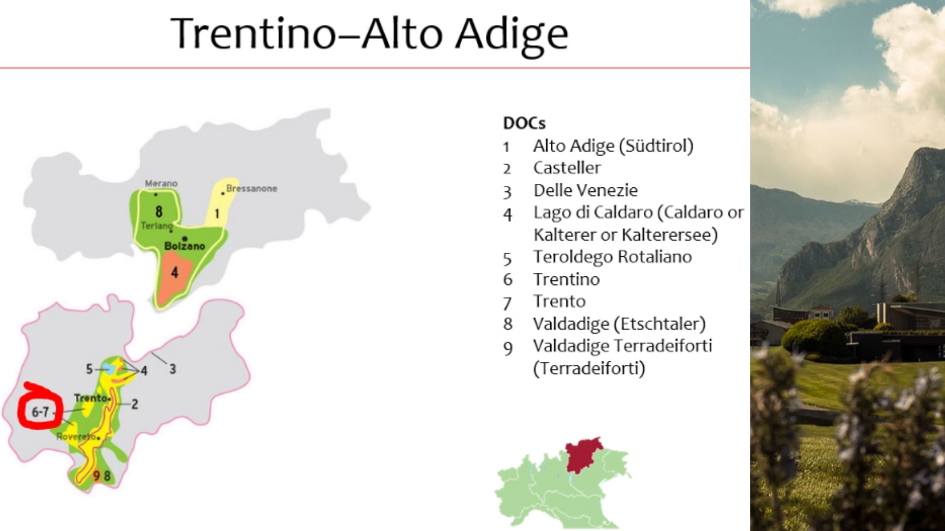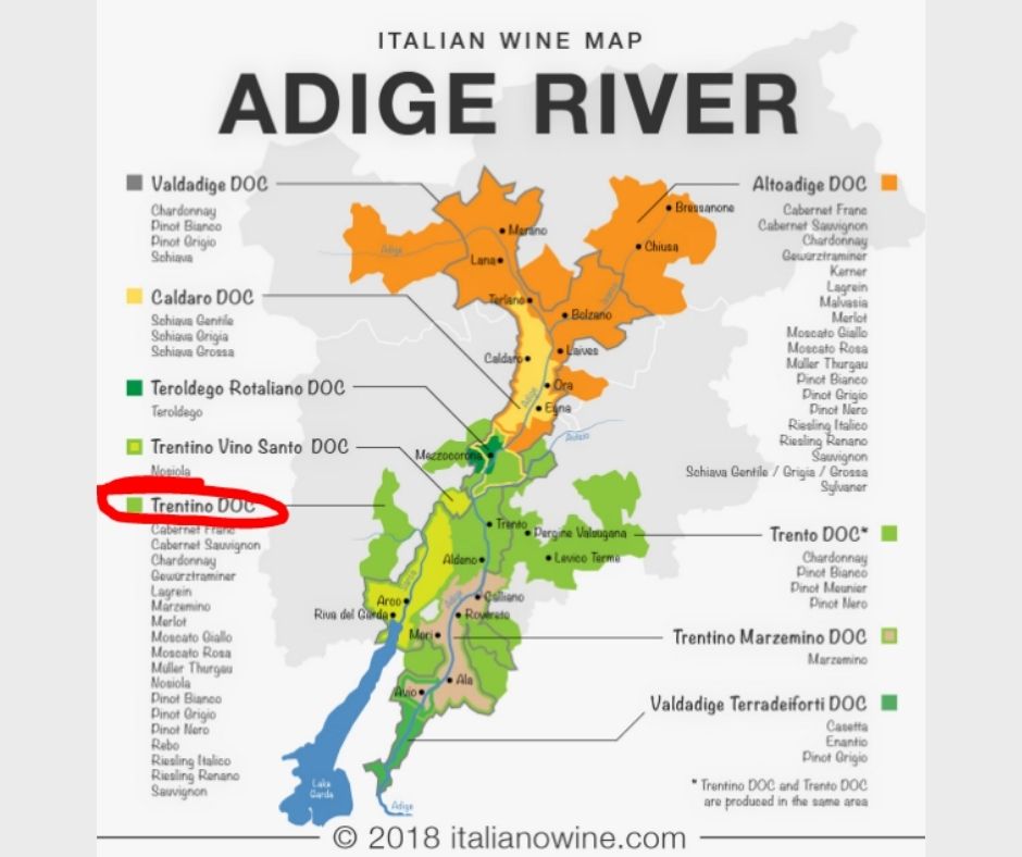 Le Trentino – Alto Adige est constitué de deux régions dont Trentino et Alto Adige. Cette dernière plus au nord, est la plus petite d’Italie et est de prédominance allemande. Le Trentino, la moitié sud, est principalement italophone et largement responsable de la production de raisins internationaux non indigènes.