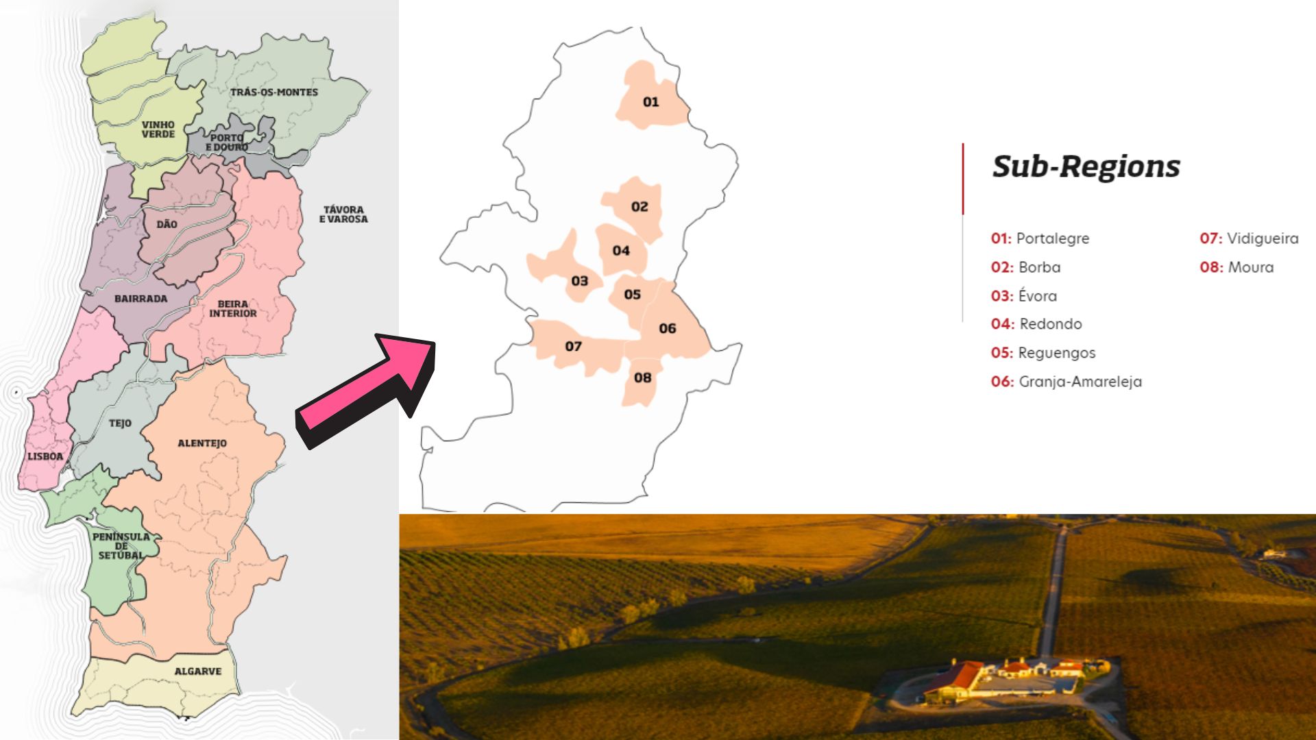 Ce vin provient de la région d’Alentejo la plus grande région viticole du Portugal et aussi celle avec la plus grande diversité car elle regroupe huit sous-régions différentes (Borba, Évora, Granja-Amareleja, Moura, Portalegre, Redondo, Reguengos et Vidigueira, regroupées en trois groupes distincts) qui s’étalent sur 22 000 hectares de vignobles. On y retrouve des sols d’argile, de calcaire, de marbre, de sable, de schiste et de granit.