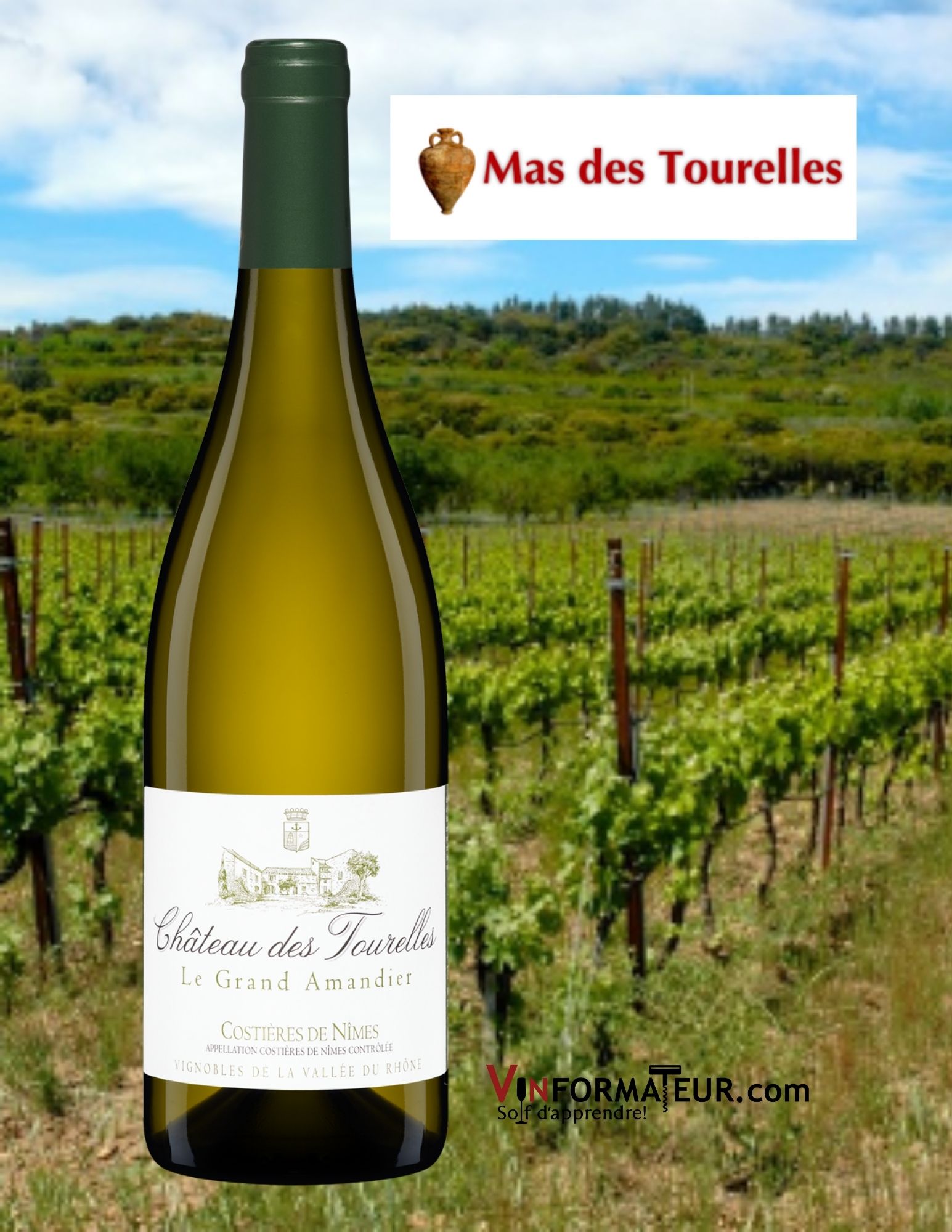 Château des Tourelles, Le Grand Amandier, France, Costières de Nîmes, 2020, vin blanc, 16,15$, cépages : Roussanne 50 %, Grenache 40 %, Viognier 10 %, sucre : 1.2 g/l, alc. : 13.5%, code SAQ : 11905112.