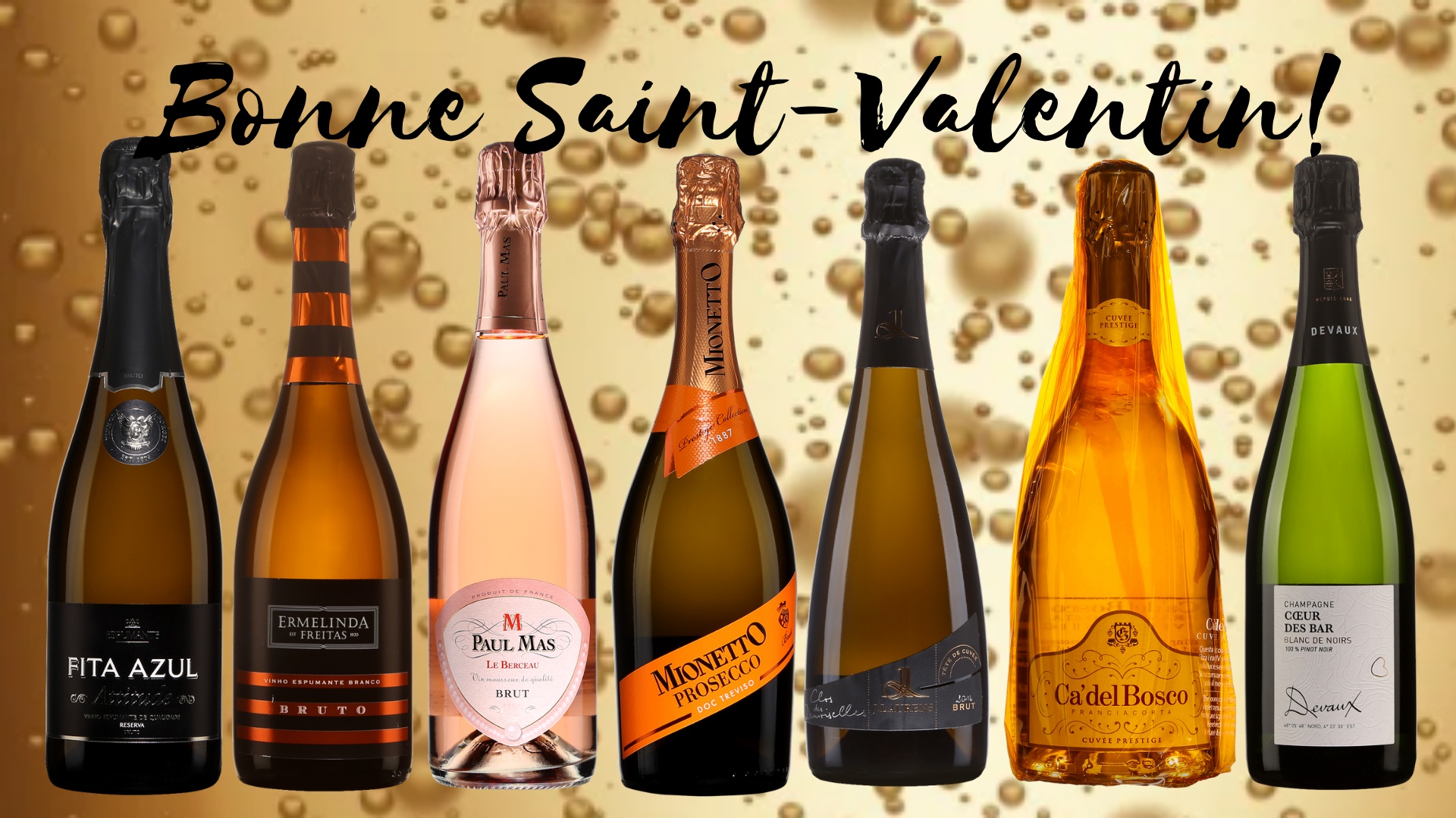 Voici quelques suggestions de vins mousseux choisis parmi les grandes appellations: Proseccos et Franciacortas d’Italie, Crémants et Champagnes de France et Espumante du Portugal!!
