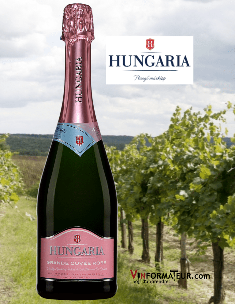Hungaria, Grande Cuvée, Rosé, Extra Dry, Hongrie, 12,90$, cépages : Pinot Noir 70%, Kékfrancos 30%, sucre : 15.0 g/l, alc. : 11.5%, code SAQ : 12397130.
