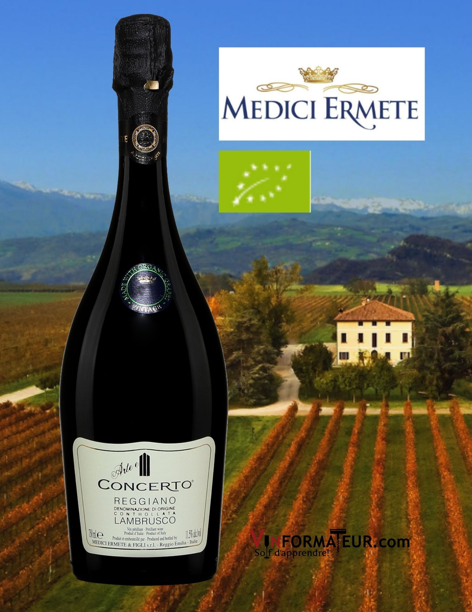 Concerto Reggiano, Lambrusco, Italie, Emilie-Romagne, vin rouge effervescent bio, 2021, 19,95$, cépage : Lambrusco 100%, sucre : 12.0 g/l, alc. 11.5%, code SAQ : 733261.