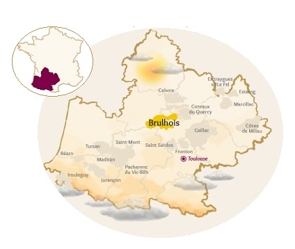 Brulhois signifie « terre brûlée », par le soleil. Cette AOC est pratiquement un confluent de plusieurs influences tant de Bordeaux avec des cépages tels le Merlot, le Cabernet-Sauvignon, le Cabernet Franc, le Tannat qu’on retrouve au pied des Pyrennées, le Fer Servadou de Marcillac et Gaillac, le Cot (Malbec) du Sud-Ouest (aussi d’Argentine) et l’Abouriou de la Vallée de la Garonne.