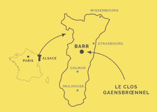 »Planté à une altitude qui varie en moyenne entre 200 et 400 mètres, le vignoble alsacien s’étend sur les collines sous-vosgiennes face à la plaine d’Alsace et au Rhin. Le massif montagneux des Vosges le protège de l’influence océanique et des précipitations en faisant l’une des régions de France à la pluviométrie la plus faible. Les expositions variées et la proximité d’un fleuve offrent un micro-climat semi-continental chaud, sec et ensoleillé, particulièrement bénéfique pour le vignoble. L’alternance de journées chaudes et de nuits fraîches en automne est propice à une maturation lente et prolongée des raisins ».