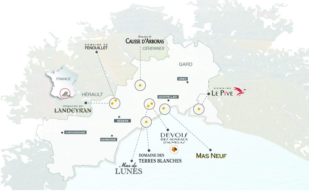 Depuis 5 générations, la famille Jeanjean met en valeur les terroirs du Languedoc. Aujourd’hui, la famille possède 8 propriétés dans le Languedoc qui reflètent la diversité des divers terroirs : appellation régionale du Languedoc, appellations singulières comme les Sables de Camargue, les Terrasses du Larzac ou le Muscat de Mireval, Crus reconnus ou en cours de reconnaissance comme Saint Chinian de Roquebrun, Faugères et Grés de Montpellier.