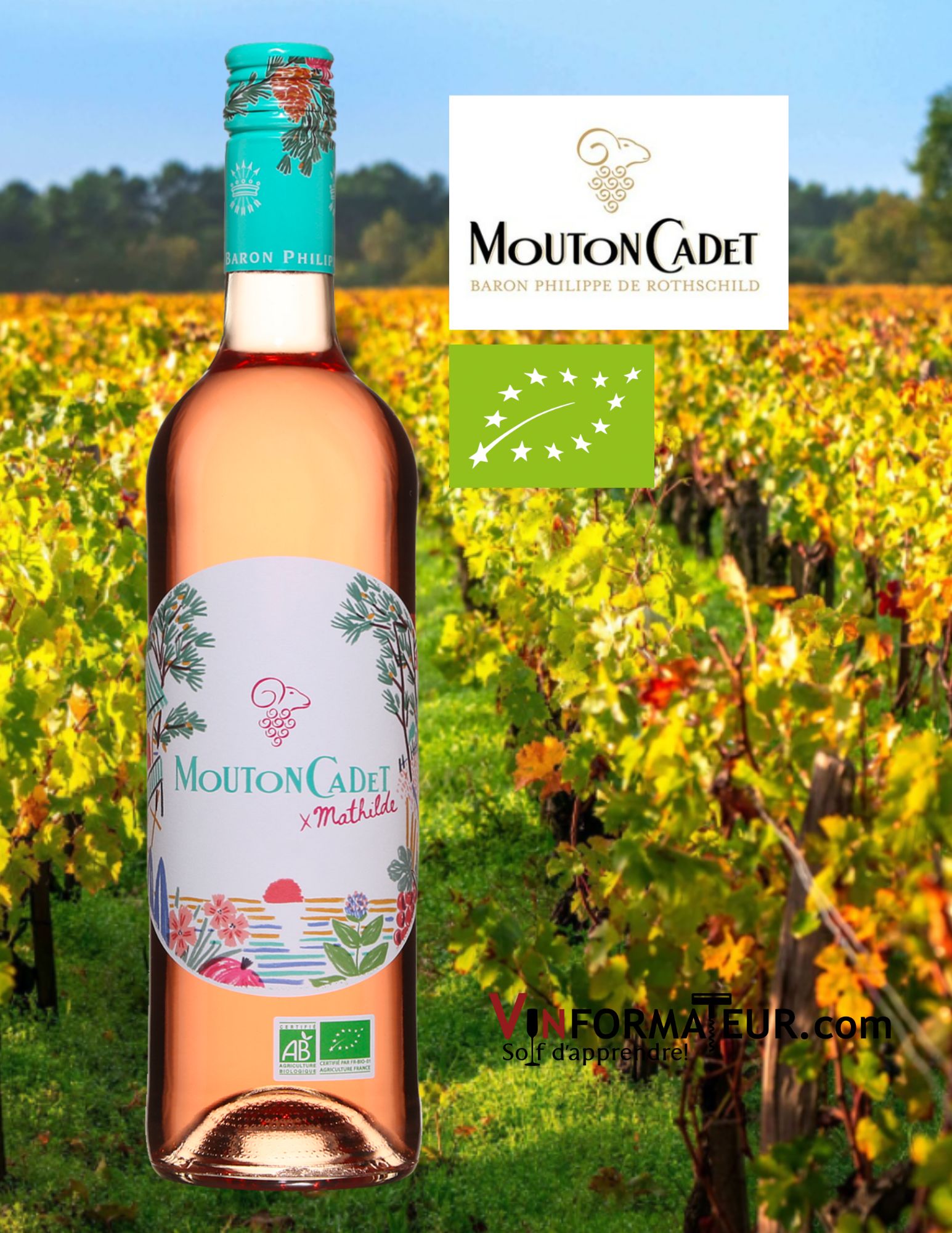 Mouton Cadet, Cuvée X Mathilde, vin rosé bio et vegan, Bordeaux, 2022, 19,95$, cépage : Merlot 100%, sucre : moins de 1.2 g/l, alc. : 12%, code SAQ : 15174986.