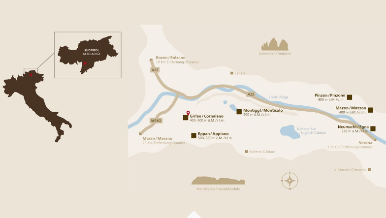 Cantina Girlan a été fondée en 1923 par 23 vignerons dans une ancienne ferme du XVIe siècle. Aujourd’hui, environ 200 vignerons ainsi que leurs familles exploitent une superficie d’environ 220 hectares de vignobles dans les meilleures zones de production d’Oltradige et de Bassa Atesina. L’œnologue de la maison, Gerhard Kofler, est en contact constant avec les vignerons et fournit ses conseils professionnels pendant la saison de croissance.