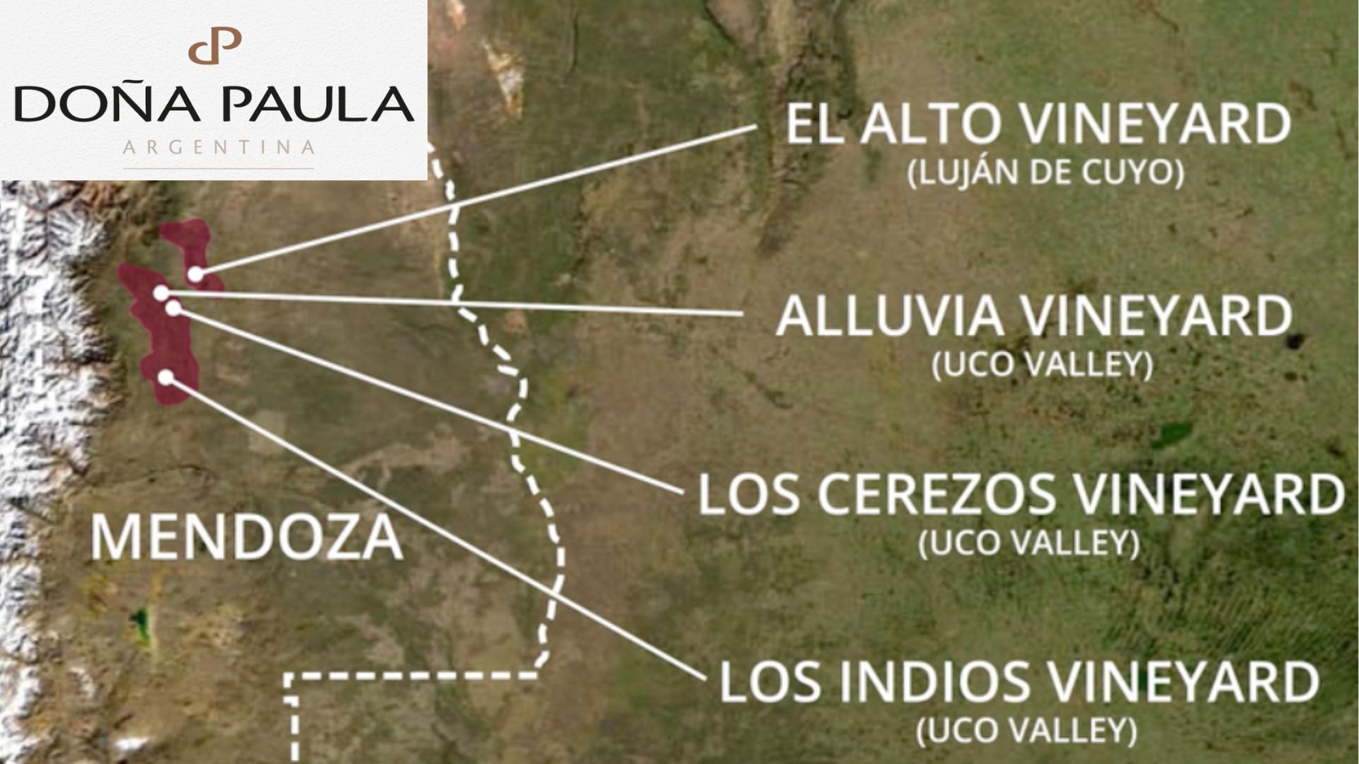 Les vignobles de Doña Paula sont répartis dans deux zones majeures de Mendoza. À Luján de Cuyo, le domaine cultive la Finca El Alto, située à Ugarteche. Dans la vallée de l’Uco, les parcelles s’étendent notamment à Tupungato, avec la Finca Aluvia à Gualtallary, ainsi qu’à San Carlos, au sein de la Finca Los Indios à El Cepillo. Ces secteurs se distinguent par leur altitude élevée, la diversité de leurs sols et de fortes amplitudes thermiques, des conditions déterminantes pour la recherche de fraîcheur, de précision aromatique et d’équilibre structurel.