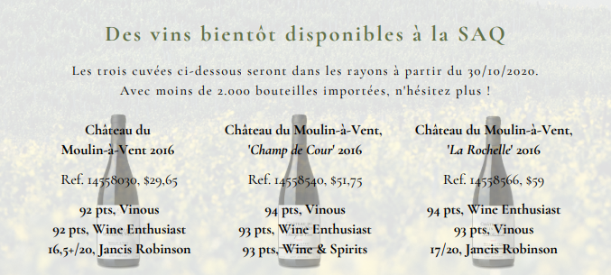 Château du Moulin à Vent, Beaujolais, Moulin-à-Vent AOC, 2016, $29.65, cépage: Gamay 100%, sucre: 1.5 g/l, alc.: 13%, alc. : 13%, code SAQ : 14558030.