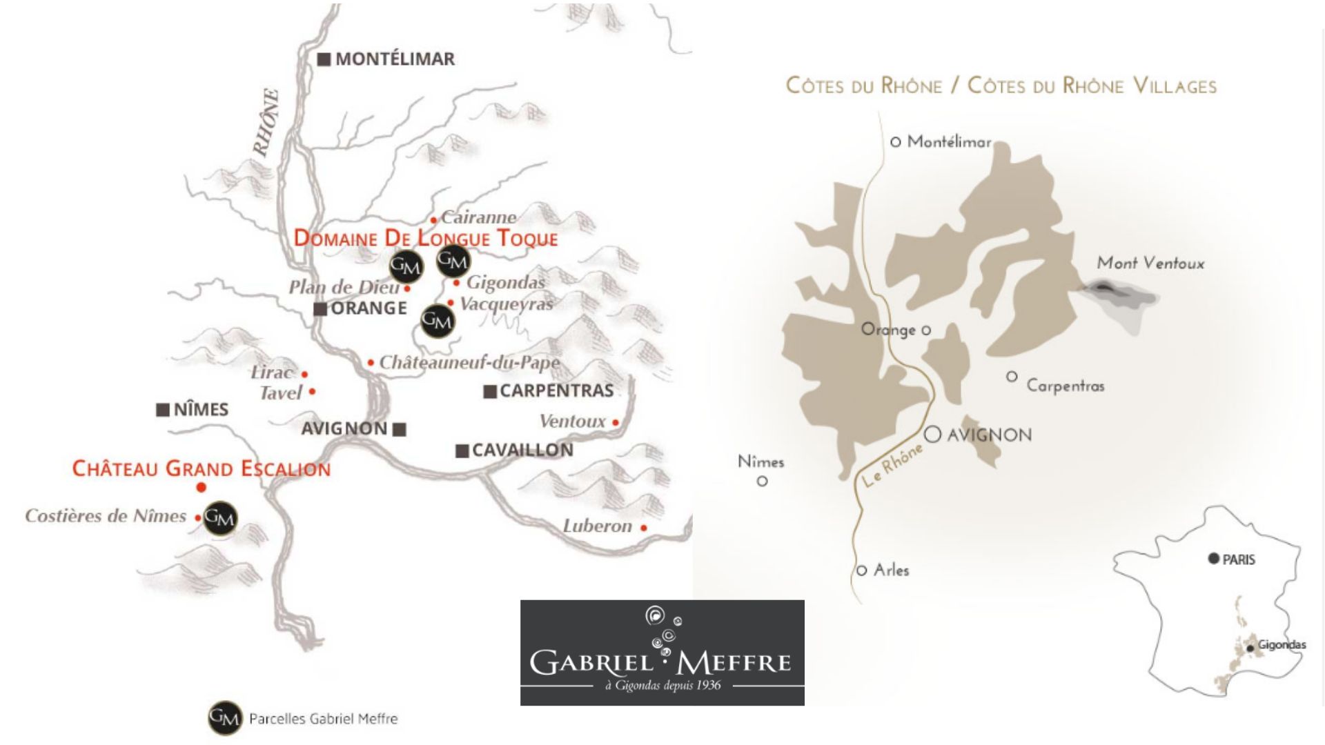 L’histoire de la Maison Gabriel Meffre débute en 1936, lorsque Gabriel et son épouse, passionnés de vin, créent leur affaire de “Négociant-Vinificateur” à Gigondas. Plus de 80 ans plus tard, l’affaire familiale s’est structurée, développée et est aujourd’hui une Maison phare de la Vallée du Rhône méridionale au double savoir-faire de Négociant-Eleveur & Producteur, reconnue pour la qualité de ses vins.