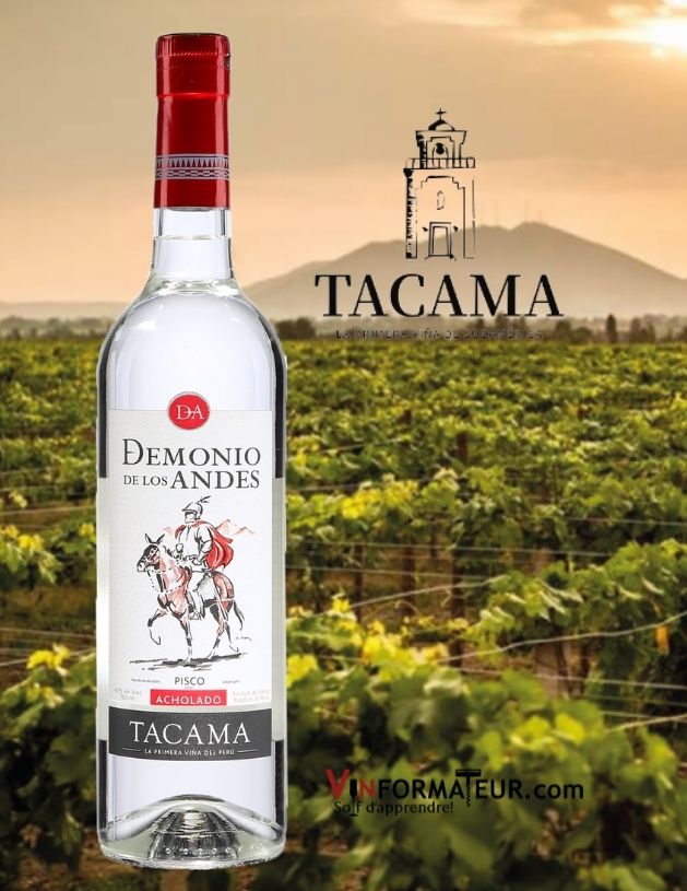 Le Pisco Demonio est Pisco de type Acholado élaboré par la société Vina Tacama, dans la région d’Ica au sud de Lima dans les vallées de Pisco. Il est élaboré à partir d’une sélection exclusive de cépages de vignes, tels que la Quebranta, l’Albilla, Torontel, Moscatel et Italia, variétés centenaires chez Tacama qui traditionnellement ont servi à l’élaboration des meilleurs Pisco du Pérou.