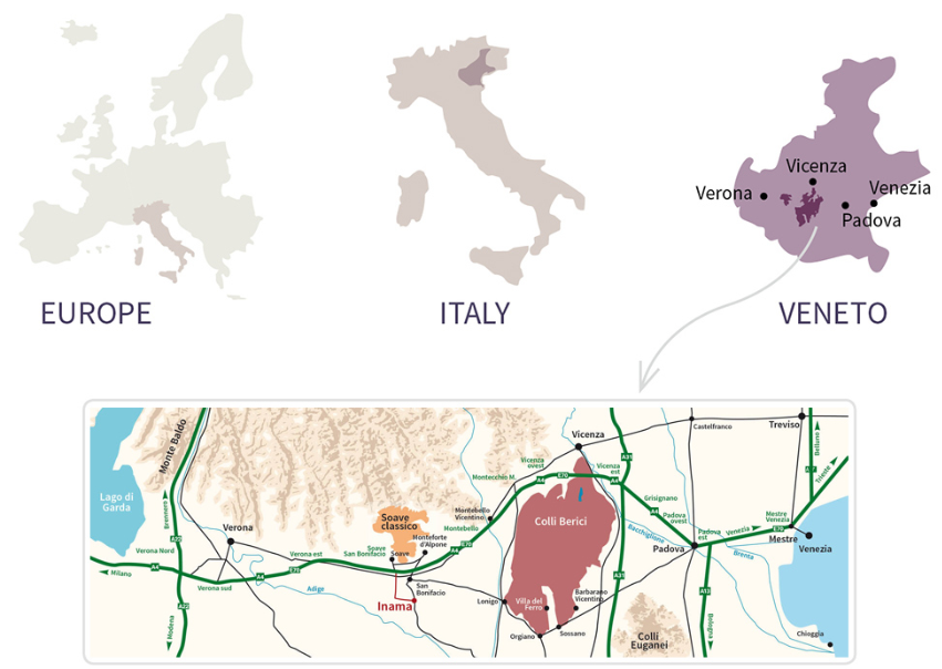 Inama est une jeune entreprise familiale créée par Giuseppe Inama et dirigée par son fils Stefano. Le début des années 1990 marque une époque ou la production des vins de Vénitie est axée sur la quantité plutôt que la qualité. Les vignes sont plantées sur des plaines ou les sols sableux entraînent la typicité du Soave qui était souvent décrit à cette époque comme un vin plat.