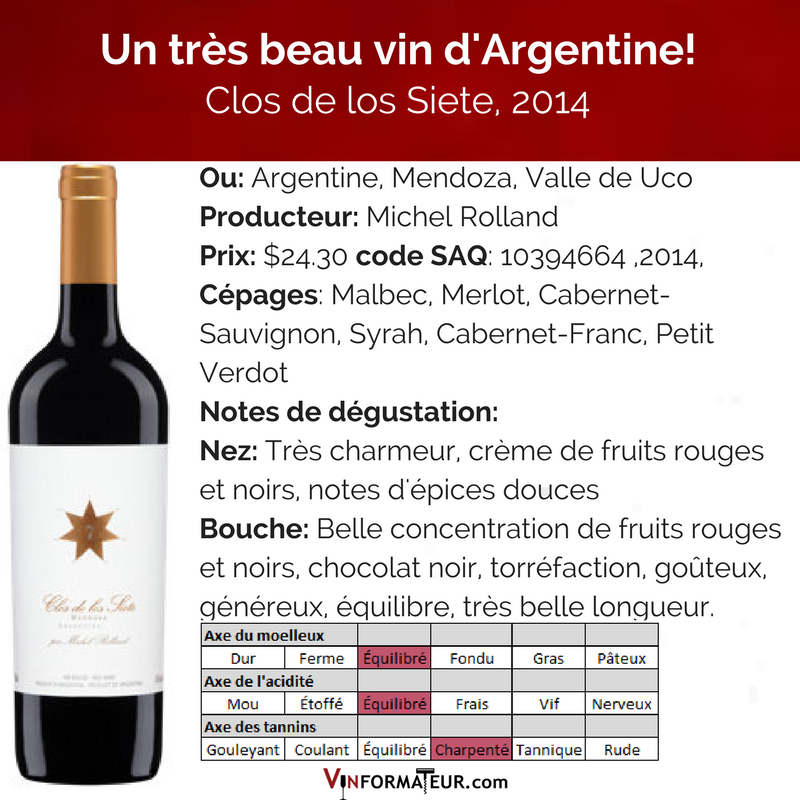 Clos de los Siete, Argentine, Mendoza, Valle de Uco, Vistaflores, 2014, $24.30, cépages : Malbec 54%, Merlot 18%, Cabernet-Sauvignon 13%, Syrah 8%, Cabernet-Franc 4%, Petit Verdot 3%, code SAQ : 10394664. Noté 93 pts James Suckling, 90 pts Wine Enthusiast.
