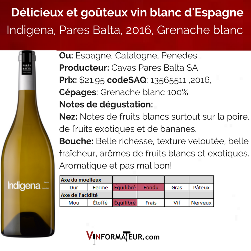 Le Pares Balta, Indigena, 2016, produit Bio, cépage : Grenache blanc, $21.95, code SAQ : 13565511