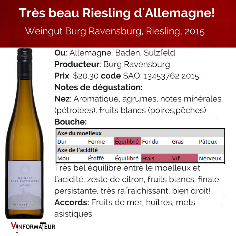 Le Weingut Burg Ravensburg, Riesling, Bio, 2015, $20.30, sucre: 7.3g/l, 12.5% alc., code SAQ: 13453762