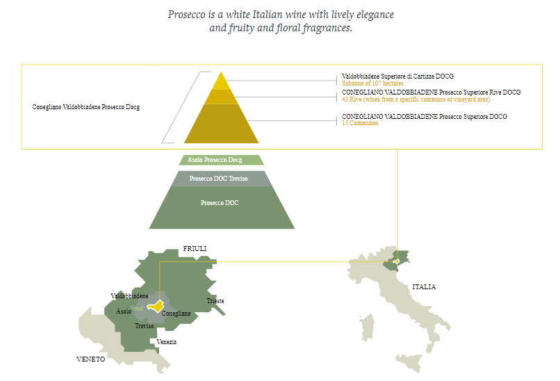 Les vins autour de Valdobbiadene peuvent être appelés Valdobbiadene Prosecco DOCG et ceux autour de Conegliano peuvent être appelés Conegliano Prosecco DOCG.