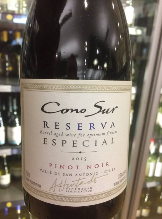Vous aimez les Pinot Noir genre nouveau monde, vous aimerez ce vin du Chili, Vallée de l’Aconcagua, Cono Sur, Reserva, 2015, $15.10 avec une super note de 93 avec Wine Spectator (parmi les 100 meilleurs vins 2016).