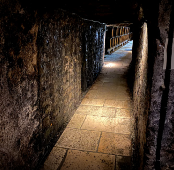 Nous descendons vers les caves du XIIIe siècle de l’église Notre-Dame. Leur architecture est des plus spéciale car elles ont été bâties à la manière d’une église. Nous sommes totalement entourés de barriques et de fûts.